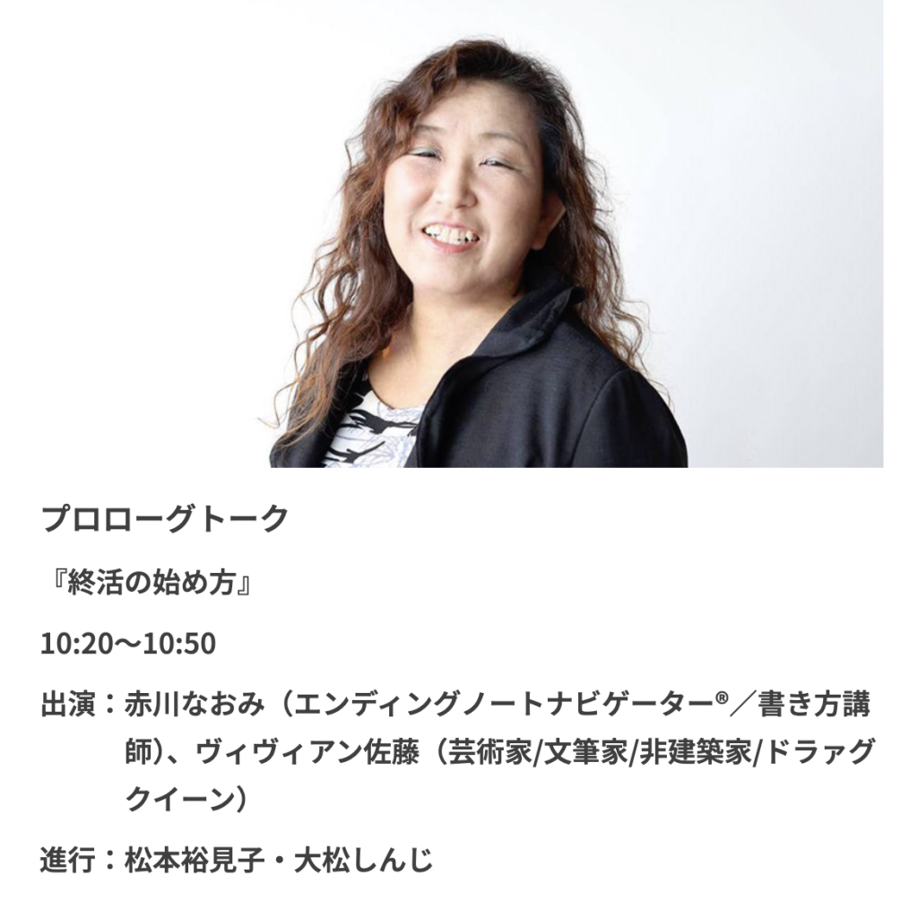 16日には、理事長・赤川直美がメインステージのプロローグトークに登壇し、MCの松本裕見子さん、大松しんじさん、ゲストのヴィヴィアン佐藤さんとともに、「終活の始め方」についてお話します🎤