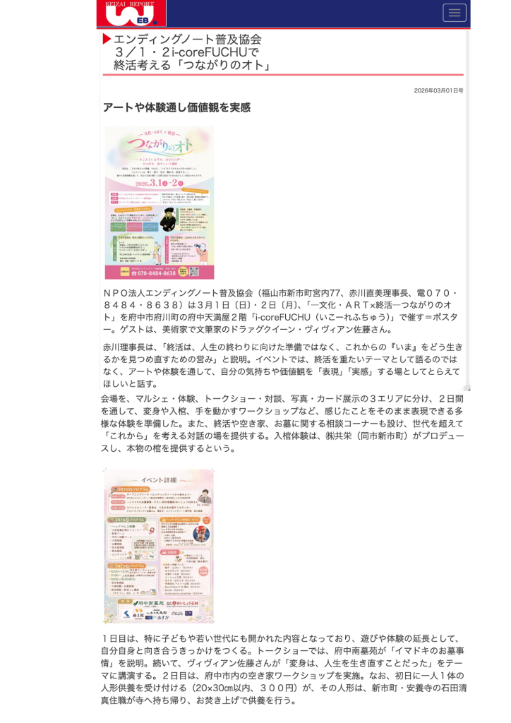 3月1日(日)、2日(月)に広島県府中市で開催する、終活×文化・ARTイベント「つながりのオト」を、経済リポート備後版で掲載していただきました!